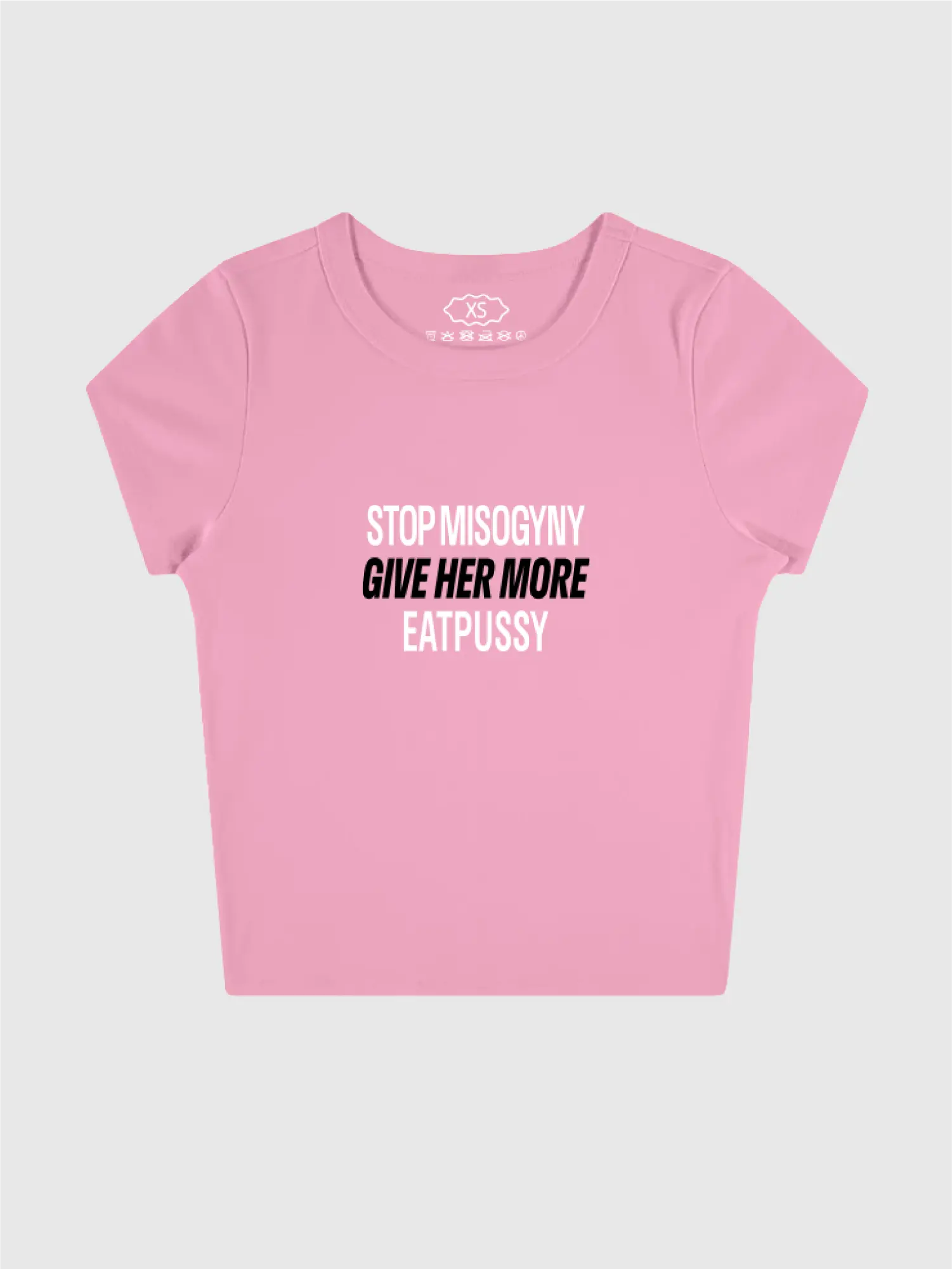 „Stop Misogyny, Give Her More, Eatpussy" rovnou na hrudi a malý Edevil symbol na zádech, pro ty, co vědí. Slim baby tee s délkou cca po pupík, měkký materiál, fitted střih co sedí těsně na tělo.
