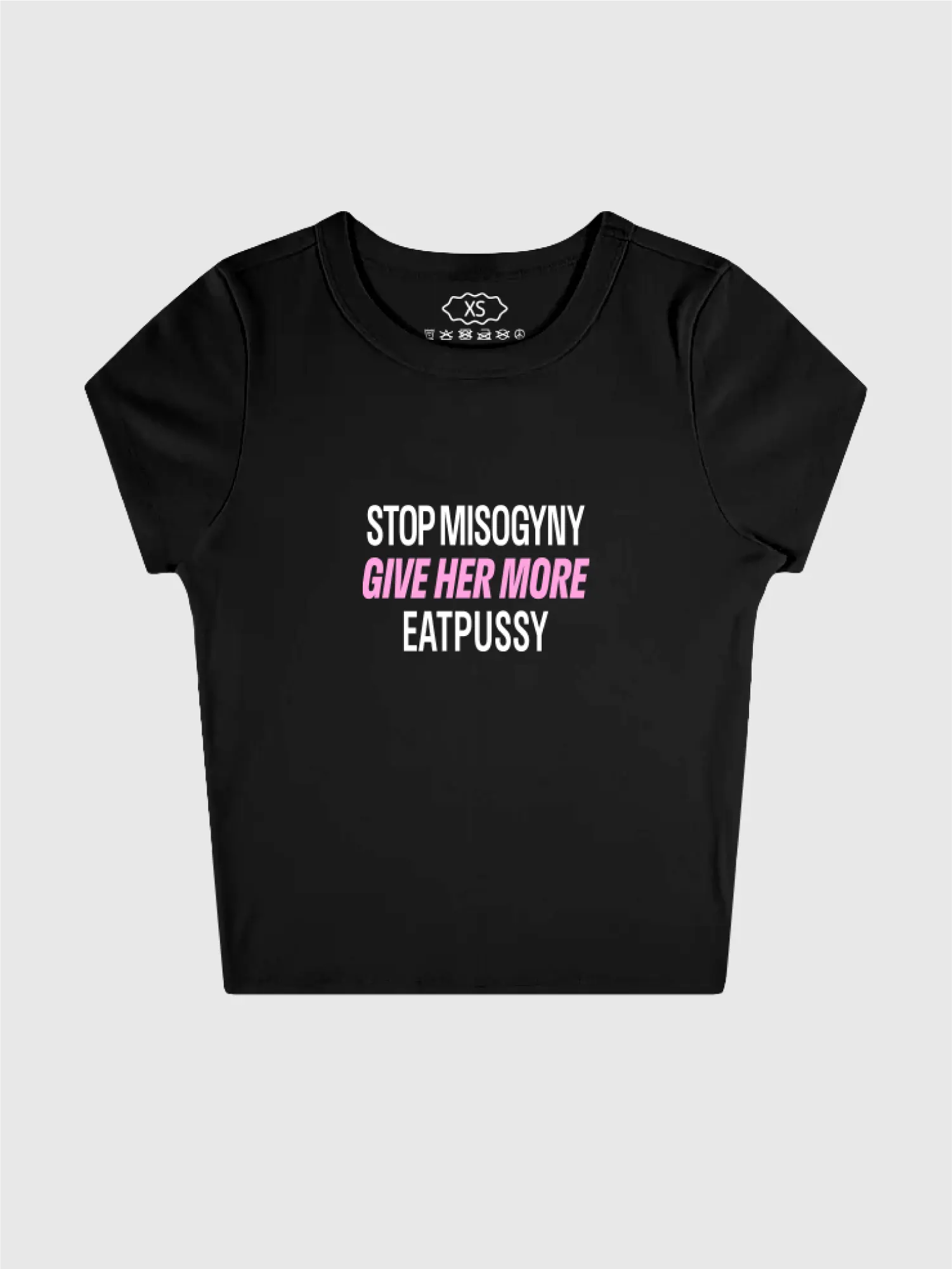„Stop Misogyny, Give Her More, Eatpussy" rovnou na hrudi a malý Edevil symbol na zádech, pro ty, co vědí. Slim baby tee s délkou cca po pupík, měkký materiál, fitted střih co sedí těsně na tělo.